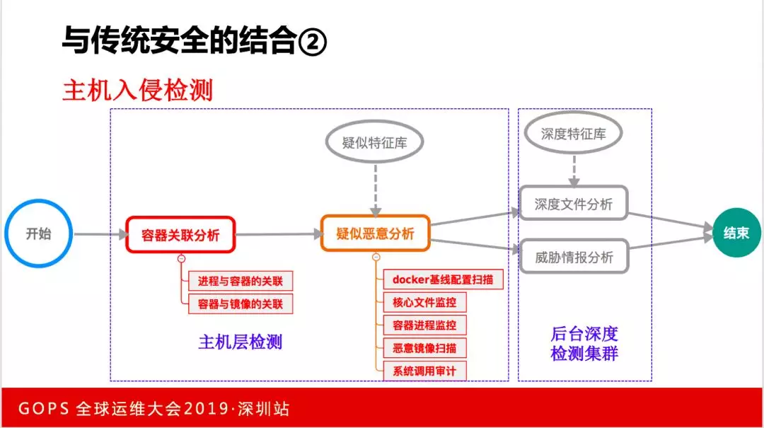主机入侵检测中,首先需要把进程和容器ID、镜像ID都关联起来,对进程和相关的webshell/恶意二进制文件进行疑似恶意分析,对于疑似的恶意文件提交到后台进行yara,符号表,特征库,ssdeep的模糊hash等方面的深度分析从而形成检测结果。在这过程中也会遇到比较大的挑战,例如webshell扫描,扫描过程中容器启停问题,业务混布,文件多而且混杂,在基线扫描方面也需要考虑的针对容器自身的安全基线和安全策略的扫描。