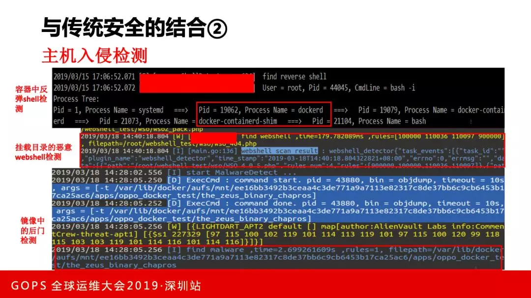 这是oppo在入侵检测方面覆盖到Docker的检测实践:第一个是检测到容器中的一个反弹shell的问题;第二个是容器外部挂载的一个目录中发现了webhsell;第三个则是在容器运行中发现的一个恶意二进制的后门。