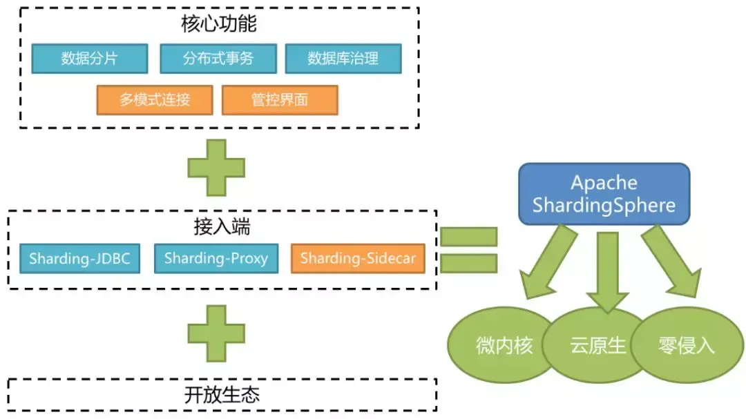 我们来看一下ShardingSphere的定位。它是一个分布式数据库中间件组成的生态圈,之所以说它是一个生态圈,是因为它整个功能的设计是一个闭环的结构,另外也会给用户提供多种接入方式,来方便用户在生产当中面对不同的接入需求。现在大家看到的是ShardingSphere的整体架构,它的功能由五大块组成。分别是数据分片,分布式事务,数据库治理,这三块已经上线交付用户使用。管控界面近期也由社区开发完成并捐献给Apache基金会。多模式连接还在规划和开发的进程中。底下是它的接入端,我们为大家提供了三款产品,分别是Sharding-JDBC,Sharding-Proxy和Sharding-Sidecar。每一款接入端都具备上面所有的功能,三款产品分别满足用户不同生产场景的需求。