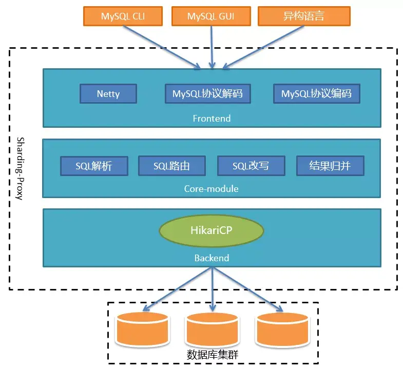 下面进入正题。Sharding-Proxy的定位是透明化的数据库代理,它封装了数据库二进制协议,用于完成对异构语言的支持。目前兼容MySQL和PG,可以使用任何兼容MySQL或PG协议的客户端进行访问,比如MySQL命令行、MySQL Workbench、Navicat等等,对DBA更加友好。