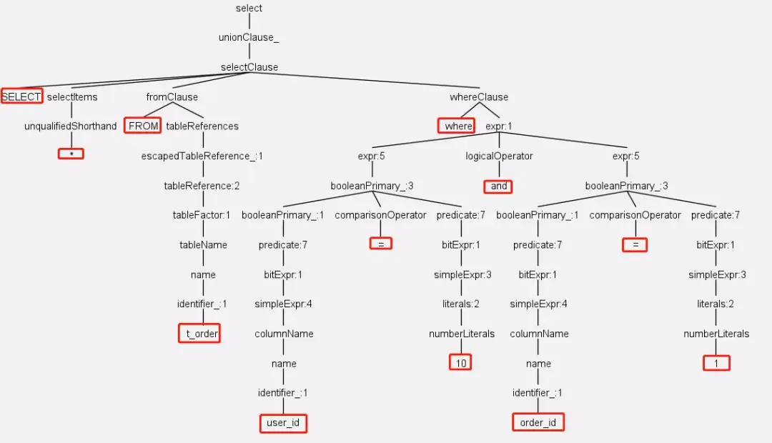 解析过程分为词法解析和语法解析。词法解析器用于将SQL拆解为不可再分的原子符号(比如select, from, t_order, 还有*, =,10),之后语法解析器将SQL转换为抽象语法树。有了这个语法树之后,通过对其遍历,就可以提炼出分片所需的上下文,并标记有可能需要改写的位置。比如user_id和order_id的值要取出来,他们是分片键,决定路由的结果。表t_order的位置要记录下来,改写的时候才能找到。
