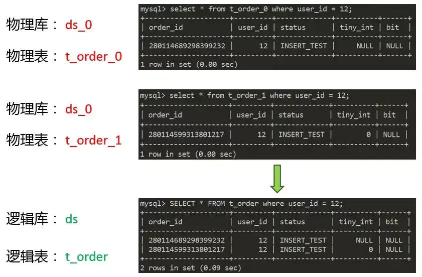 为什么要改写?上面这个面向逻辑库与逻辑表的SQL,并不能够直接在真实的数据库中执行,SQL改写的作用就是把逻辑SQL改写为可以在真实库中正确执行的真实SQL。真实库和真实表我们之前已经知道了,所以直接把SQL改写为这样。并不是所有SQL的改写都这么简单,比如聚合函数怎么改写,包含LIMIT的SQL怎么改写,什么时候需要补列,这些都是改写引擎需要处理的事情。