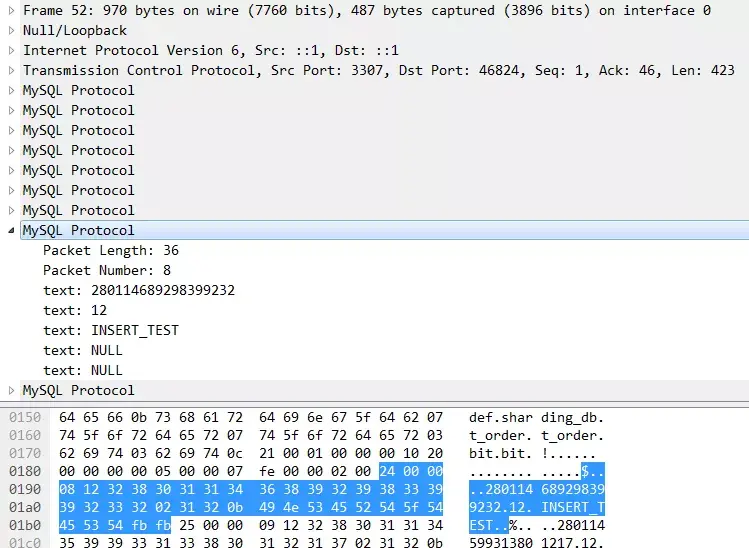 SELECT * FROM t_order where user_id = 10 and order_id = 1;我们现在看一下这个SQL是怎么来的,它的真实面目是什么。当连接Proxy的客户端执行一个SQL的时候,我们可以通过Wireshark在网络上抓到这个包。可以看到,MySQL协议是承载在TCP协议之上的。传输方向是32883端口到3307端口,这个3307是 Proxy的默认端口。MySQL协议也像大多数协议一样遵循TLV原则: