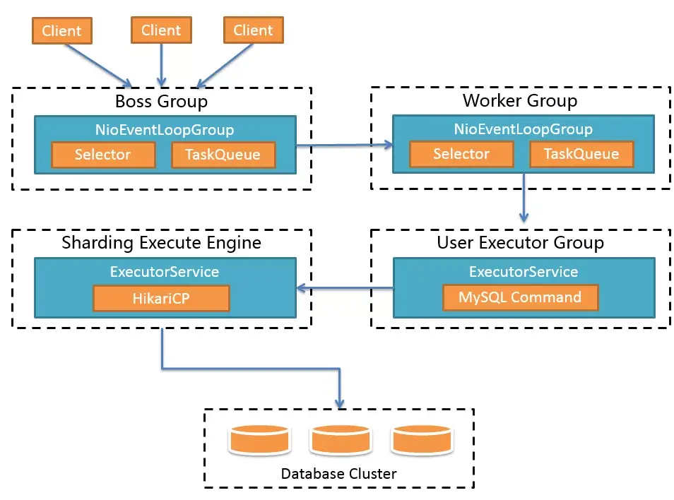 核心原理部分首先介绍一下IO模型和线程模型。可以简单理解上面两个是前端,下面两个是后端。Boss Group相当于Reactor模式中的Reactor。Worker Group相当于模式中的Worker。User Executor Group用于执行MySQL命令。Sharding Execute Engine用于并发访问数据库。大家看到Boss Group和Worker Group应该能猜到前端用的是Netty。所以前端使用IO多路复用处理客户端请求。后端使用的是Hikari连接池,同步请求数据库。如果开启XA事务,情况就会比较特殊。由于Atomiks事务管理器的资源是threadlocal的,所以一次事务的所有SQL必须全部在同一个线程中执行。在执行MySQL命令的时候会单独创建一个线程,并缓存起来。