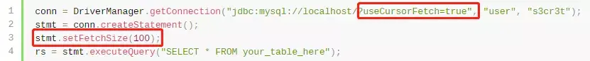 另一种方式是基于游标的流式结果集:设置JDBC参数useCursorFetch=true,表示要使用游标。设置FetchSize,指示每次返回数据的行数。
