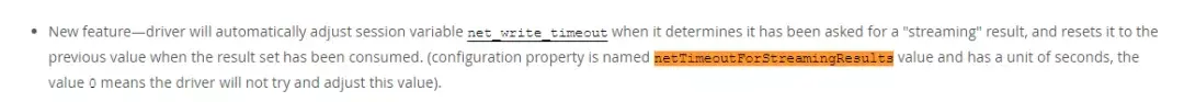 这是我从JDBC 5.1.0的Release Notes上截的图。每创建一个流式ResultSet,JDBC都会设置一次网络超时时间。导致网络上有大量的 SET net_write_timeout 请求。