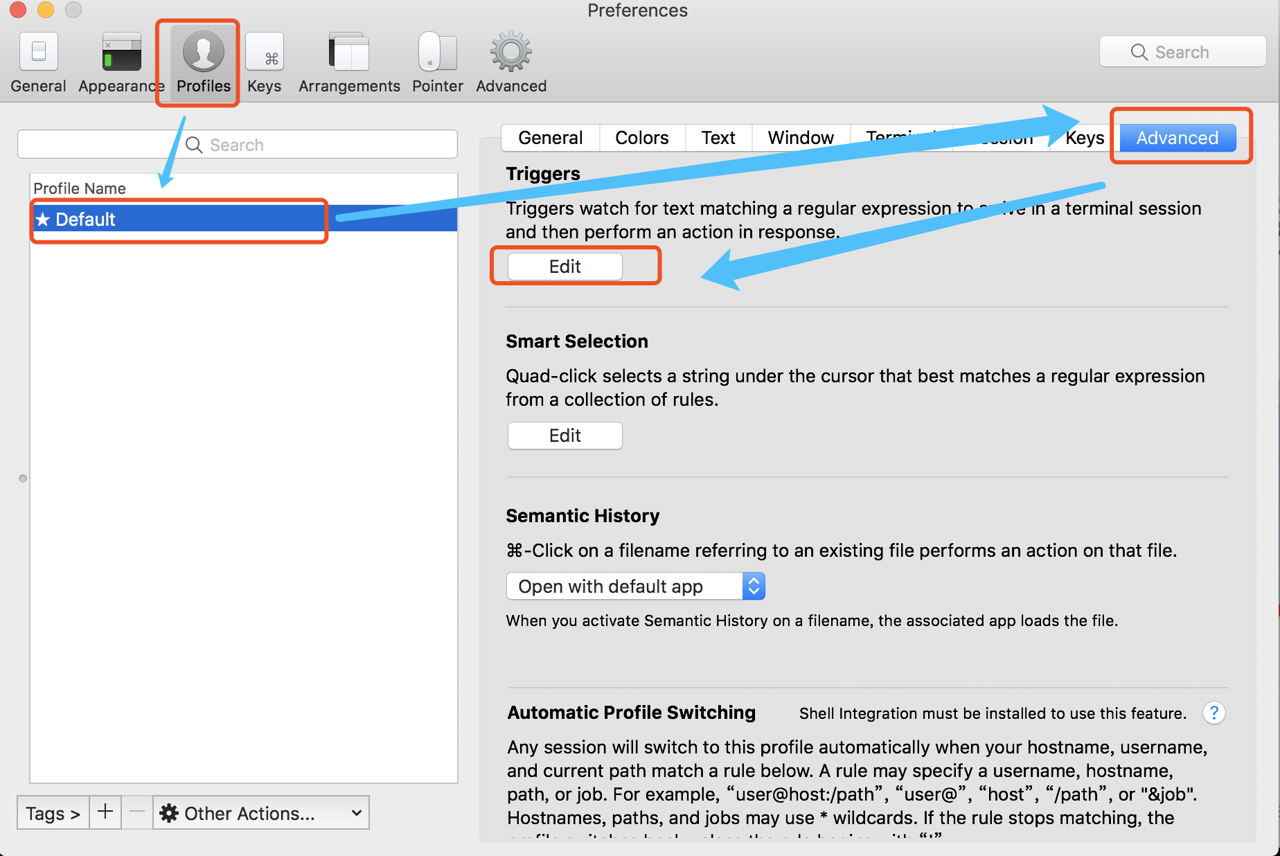 设置Iterm2的Tirgger特性,profiles->default->Advanced中的Tirgger