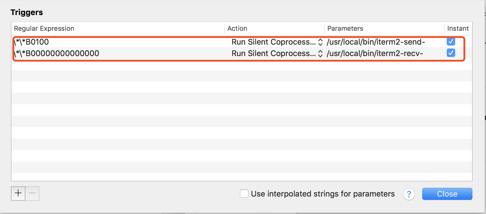 添加两条trigger,分别设置 Regular expression,Action,Parameters,Instant如下: