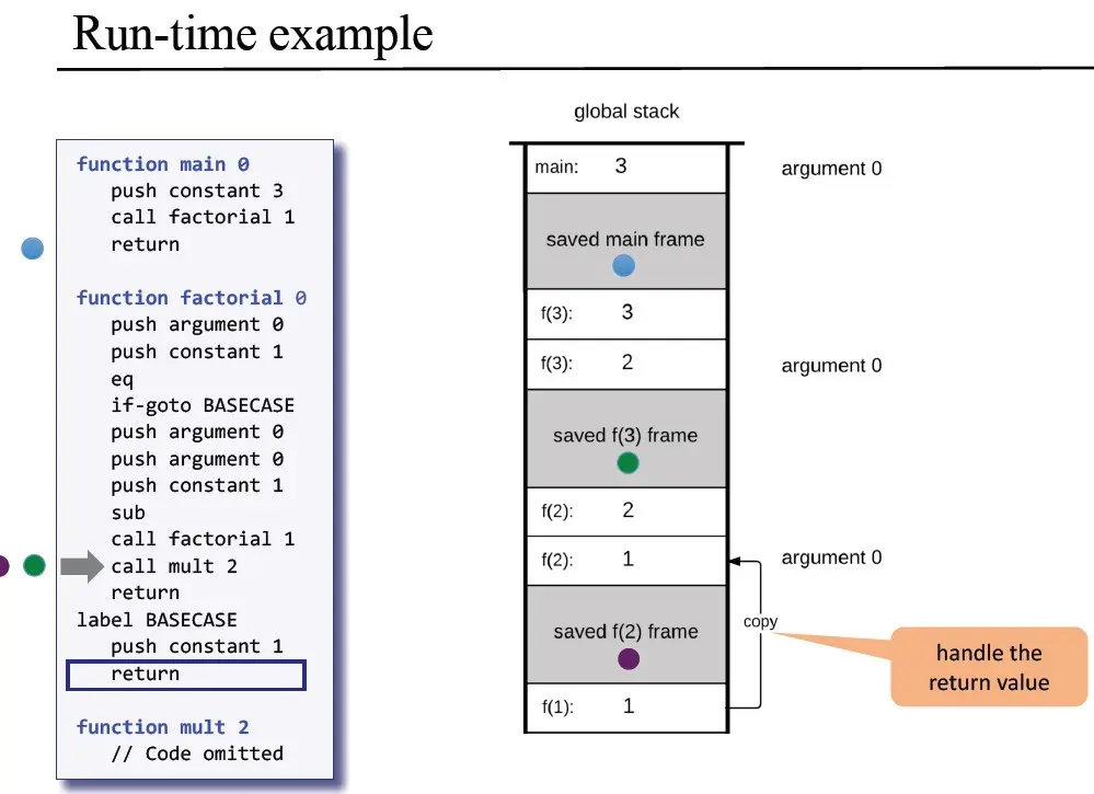 goto retAddr:由于call的时候,已经计算好了retAddr的位置(即call指令运行结束之后的位置),所以直接将program counter设置成retAddr,继续运行即可。(也就是返回caller执行)