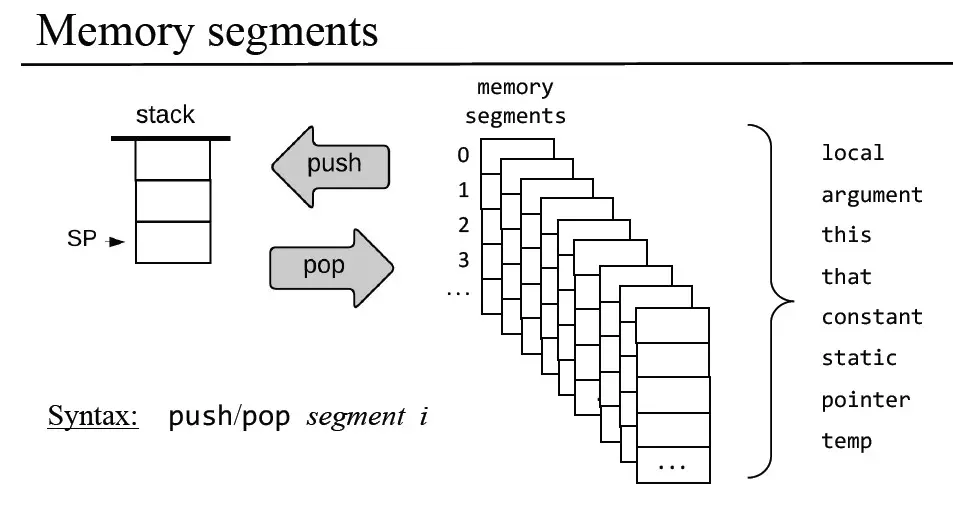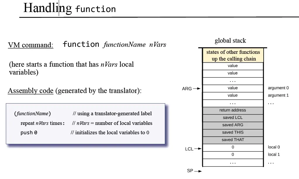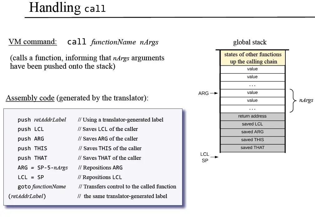 我们想要进入方法之后能返回caller,那么就必须保存caller的local,argument等区域的起始位置,那么保存在哪里呢?当然是保存在栈里,也就是上图所说的saved frame里,方法return之后,只要取出这些位置,然后再放到ram里,就能恢复caller的运行,仿佛什么事都没发生过一样(除了栈里的参数变成了方法运行之后的结果)。