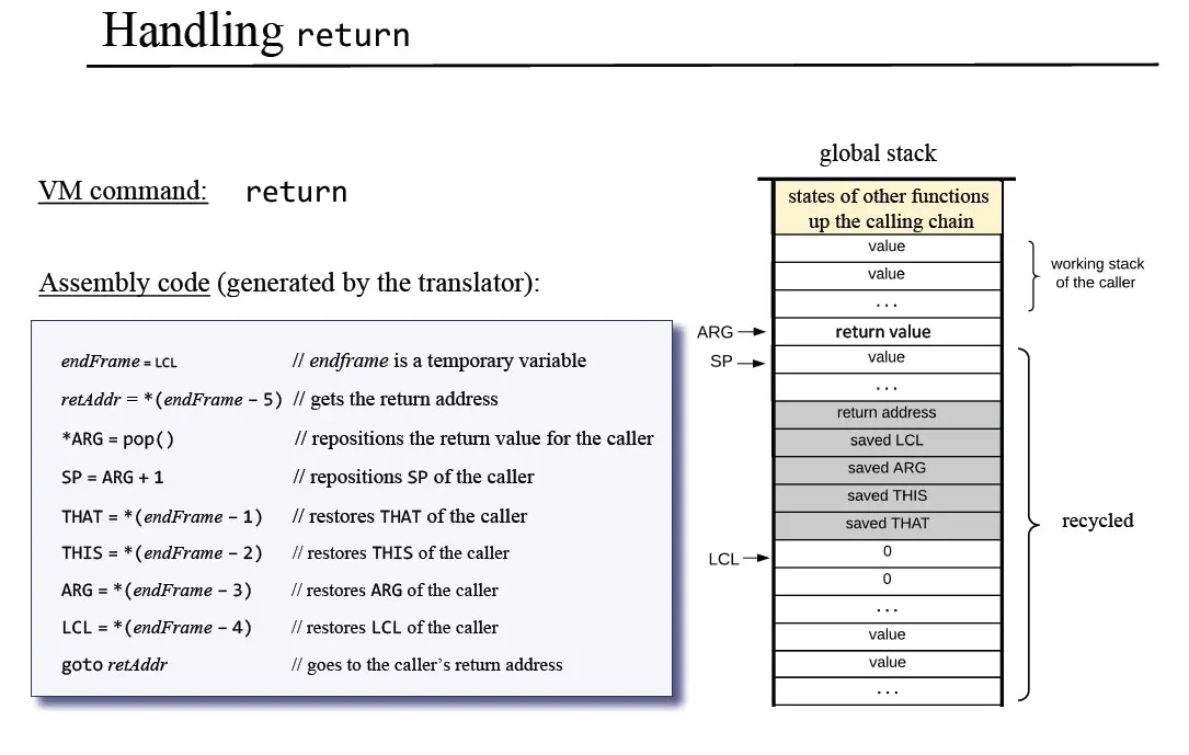 将栈顶元素放入Arg所指位置:callee执行完之后,栈顶必须是要返回的值。(而且在Jack中,只能返回一个元素。)