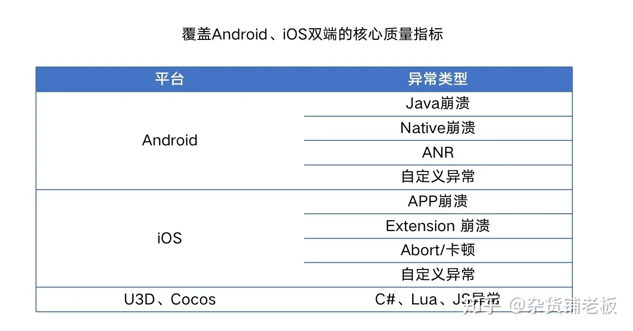在建立指标体系方面,岳鹰平台是覆盖Android、iOS双端的核心质量指标,在我们做的一些业界调研里面发现, 用户遇到最多的问题,就是崩溃、卡死/ANR;另外就是大量的业务逻辑异常。
