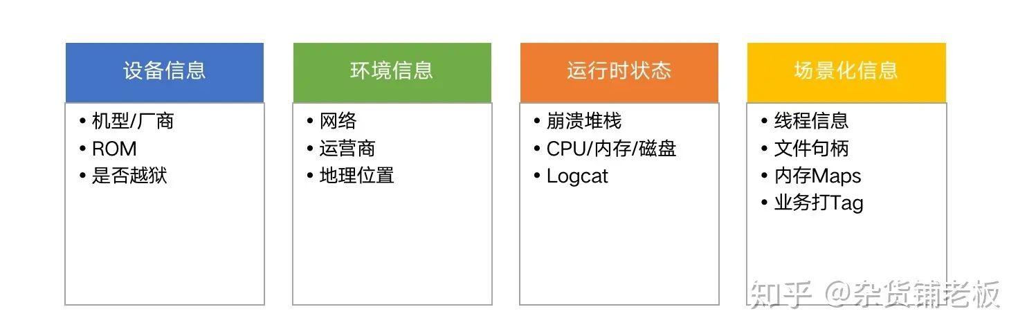 SDK具体捕获的内容下面表格可以看到,这里想特别分享的是,我们对SDK捕获的日志内容做了一些丰富,特别是一些针对性的日志信息;这里我们叫它场景化信息。