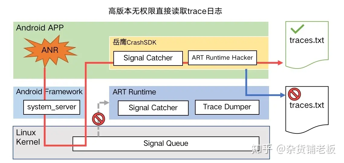 但是,谷歌在高版本(5.x)已经把读取trace日志的权限回收了,但ANR这又很影响用户体验的问题。那怎么捕获ANR呢?