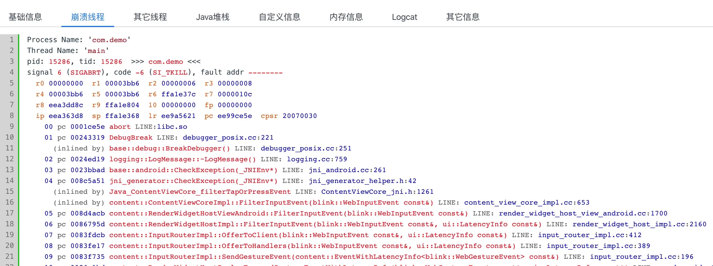 确定问题之后,接下来就是分析原因了,看代码就是最直接的办法了。 这里主要分享一点,岳鹰我们对C++场景的崩溃日志做了优化,支持C++行号的展示,以及inline函数的符号化。