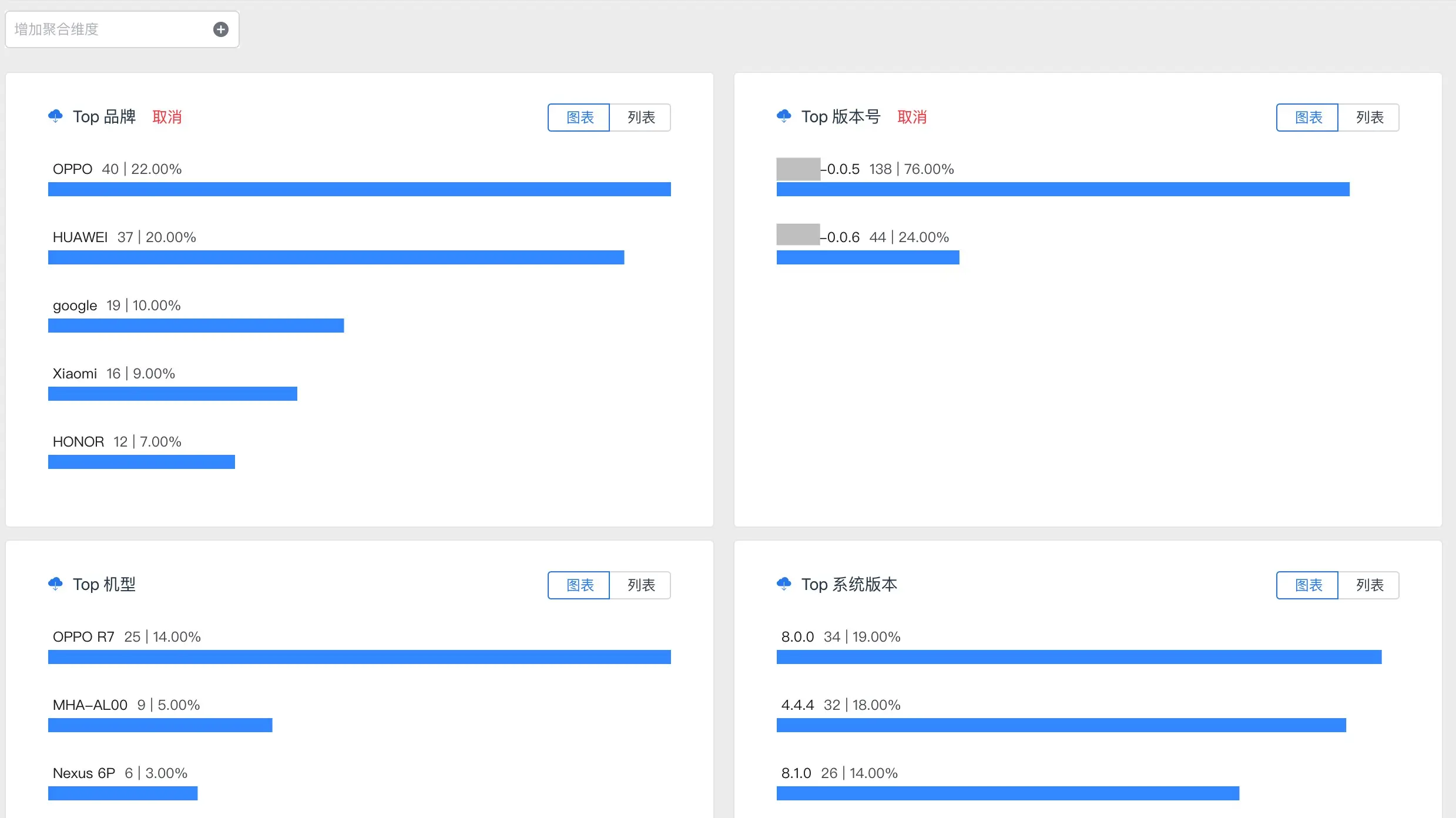 平台还支持多维度钻取,分析共性问题。 这个主要是考虑,有些崩溃问题是在指定机型、系统版本下面才会出现的,所以维度统计也是一个常用的分析手段。 另外,还可以逐个选中维度,层层分析。