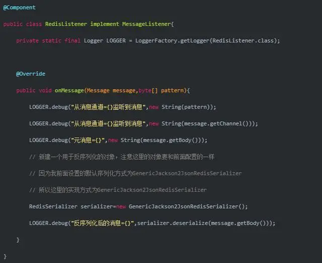 redis用作消息队列,其在spring boot中的主要表现为一RedisTemplate.convertAndSend()方法和一个MessageListener接口。所以我们要在IOC容器中注入一个RedisTemplate和一个实现了MessageListener接口的类。话不多说,先看代码