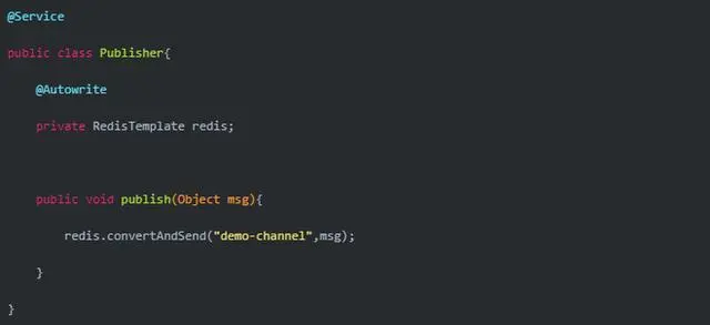 关键代码为第7行,redis.convertAndSend()这个方法的作用为,向某个通道(参数1)推送一条消息(第二个参数)。
