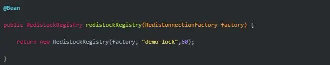 RedisLockRegistry的构造函数,第一个参数是redis连接池,第二个参数是锁的前缀,即取出的锁,键名为“demo-lock:KEY_NAME”,第三个参数为锁的过期时间(秒),默认为60秒,当持有锁超过该时间后自动过期。