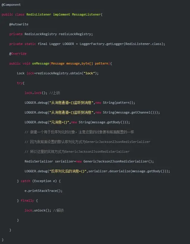 上面代码的代码比起前面的监听器代码,只是多了一个注入的RedisLockRegistry,一个通过redisLockRegistry.obtain()方法获取锁,一个加锁一个解锁,然后这就完成了分布式锁的使用。