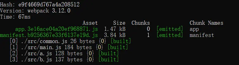 有个值得注意的点,如果多测几次就会发现,一旦修改任何代码,所有的js文件名都会修改,这显然不符合期望。比如我们单独提取 manifest.js 就是想要这个js在不修改的情况下只开始加载一次,其他时候调用浏览器缓存减少HTTP请求。这时,需要把 hash 修改成 chunkhash 。