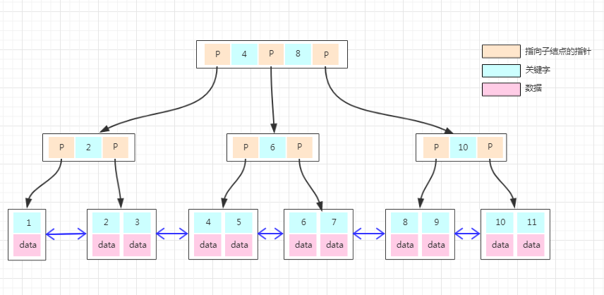 普通的 B-Tree 的结点中,元素就是一个个的数字。但是上图中,我们把元素部分拆分成了 key-data 的形式,Key 就是数据的主键,Data 就是具体的数据。