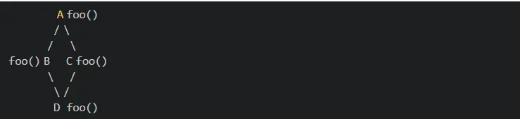 1)第一个原因是围绕钻石形继承问题产生的歧义,考虑一个类 A 有 foo() 方法, 然后 B 和 C 派生自 A, 并且有自己的 foo() 实现,现在 D 类使用多个继承派生自 B 和C,如果我们只引用 foo(), 编译器将无法决定它应该调用哪个 foo()。这也称为 Diamond 问题,因为这个继承方案的结构类似于菱形,见下图: