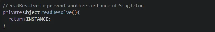 传统单例的另一个问题是,一旦实现可序列化接口,它们就不再是 Singleton, 因为 readObject() 方法总是返回一个新实例, 就像 Java 中的构造函数一样。通过使用 readResolve() 方法, 通过在以下示例中替换 Singeton 来避免这种情况: