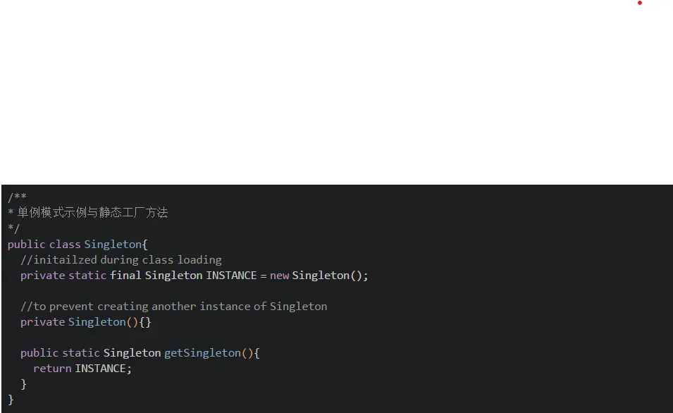 这是我最喜欢的在 Java 中影响 Singleton 模式的方法之一,因为 Singleton 实例是静态的,并且最后一个变量在类首次加载到内存时初始化,因此实例的创建本质上是线程安全的。