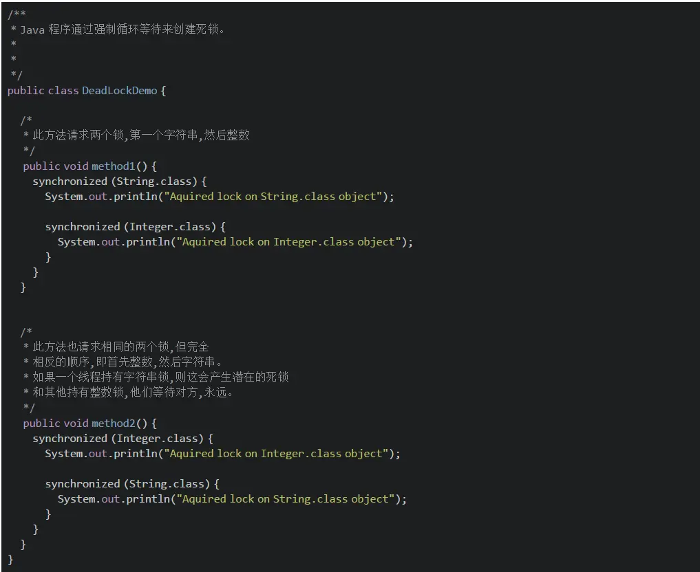 如果 method1() 和 method2() 都由两个或多个线程调用,则存在死锁的可能性, 因为如果线程 1 在执行 method1() 时在 Sting 对象上获取锁, 线程 2 在执行 method2() 时在 Integer 对象上获取锁, 等待彼此释放 Integer 和 String 上的锁以继续进行一步, 但这永远不会发生。