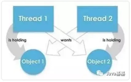 此图精确演示了我们的程序, 其中一个线程在一个对象上持有锁, 并等待其他线程持有的其他对象锁。