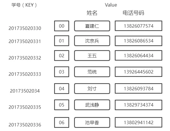 怎么正确建立学号(Key)与Value之间的映射关系呢? 我们可以通过这样的哈希运算 学号(key) - 201735020330 所得出的结果即作为存放Value的数组中,比如这个池早香,她的学号是201735020336,通过我们的哈希运算得数组下标值为6,那么我们就可以将其姓名和电话号码放进这个下标值为6的数组中。这样一个简单的哈希表就完成了。