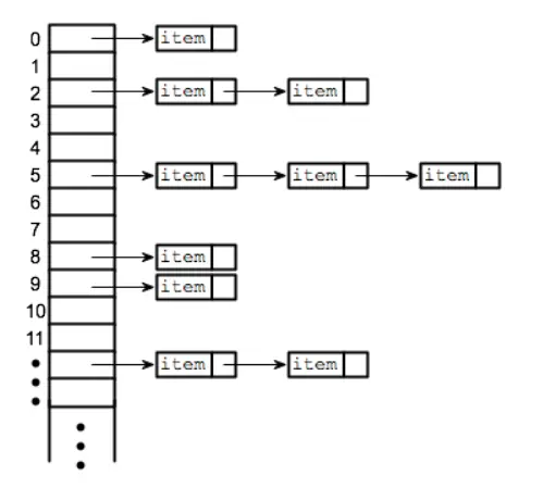 如图所示,采用链表的办法,将冲突的地址内容通过线性表的方式串联起来,然后在这个地址里通过顺序检索查找出我们想要的值。