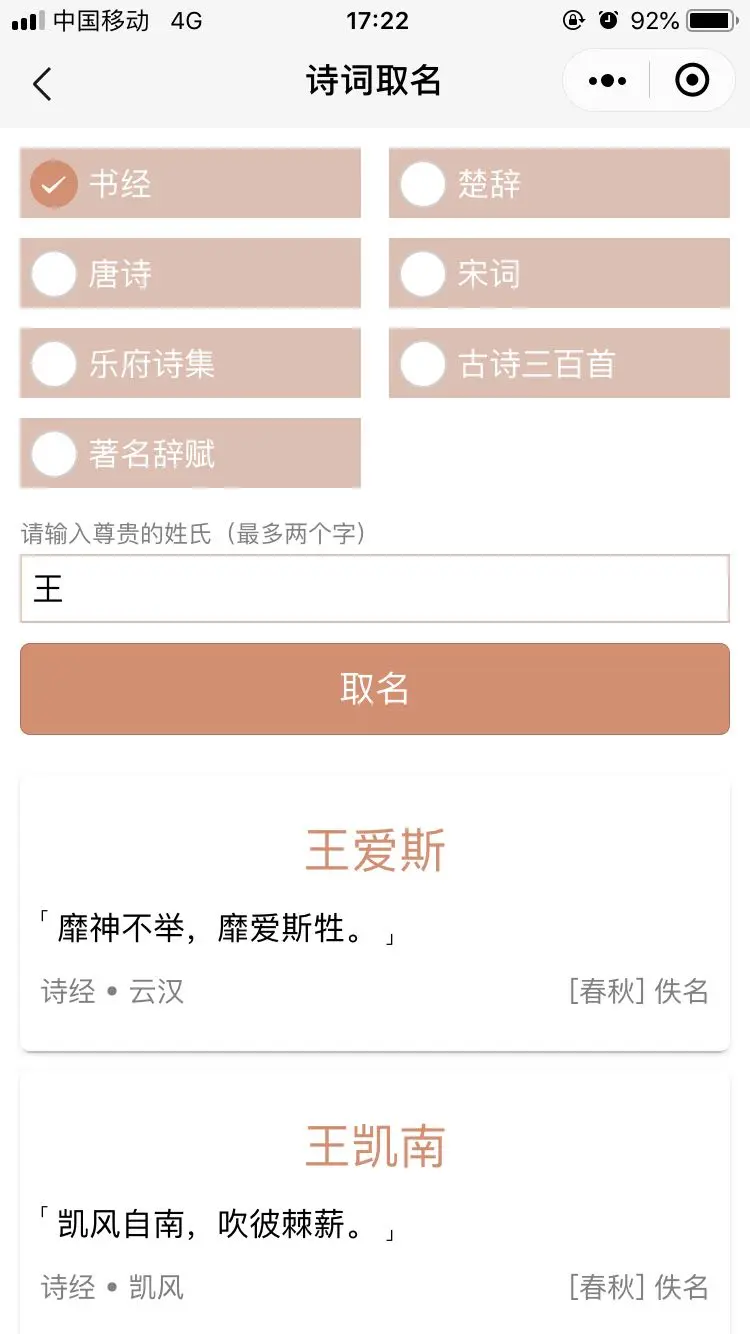 男楚辞,女诗经。好名字需根据生辰八字,个人命局进行斟酌。微信搜索小程序“取姓予名”,助你一臂之力。