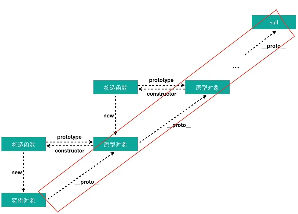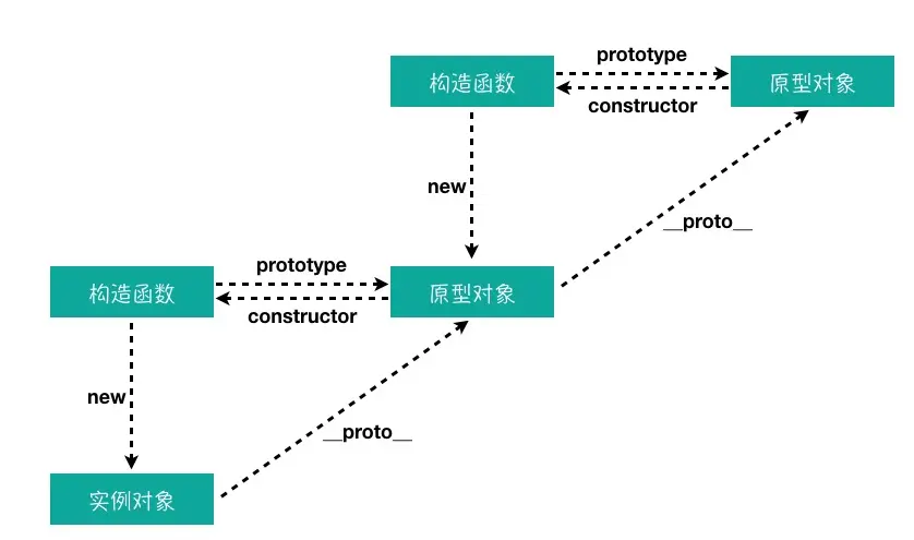 因为原型对象也是一个对象,所以它也有一个 __proto__ 属性,这个属性指向它的构造函数的 prototype。