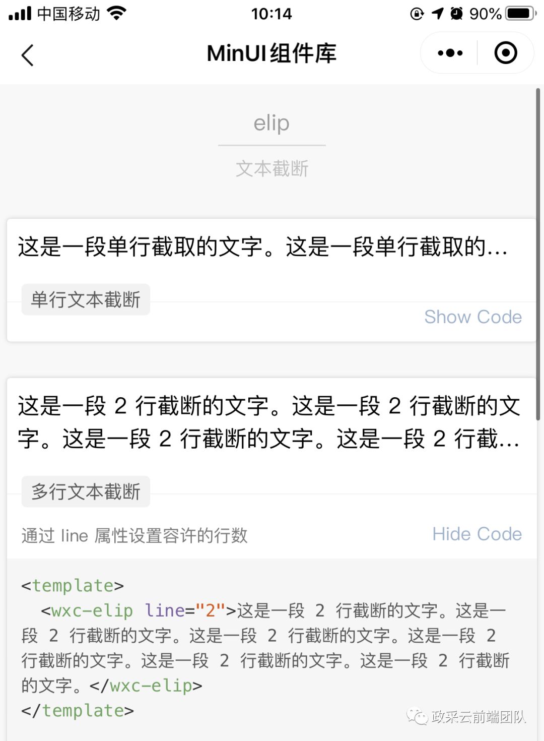 每次都要搞一坨代码,太麻烦。这时候你需要考虑将文本截断的能力,封装成一个可随时调用的自定义容器组件。市面上很多 UI 组件库,都提供了同类组件的封装,如基于 Vue 的 ViewUI Pro,或面向小程序提供组件化解决能力的 MinUI。