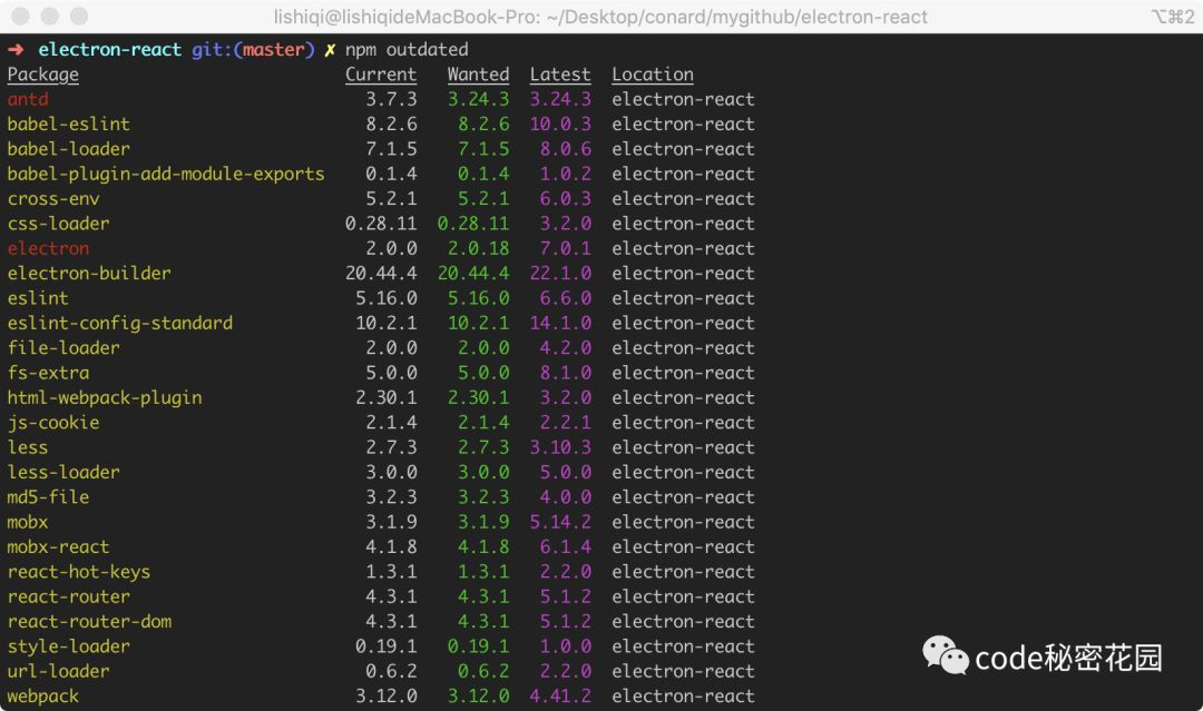 使用 npm outdated 可以帮助我们列出有哪些还没有升级到最新版本的依赖: