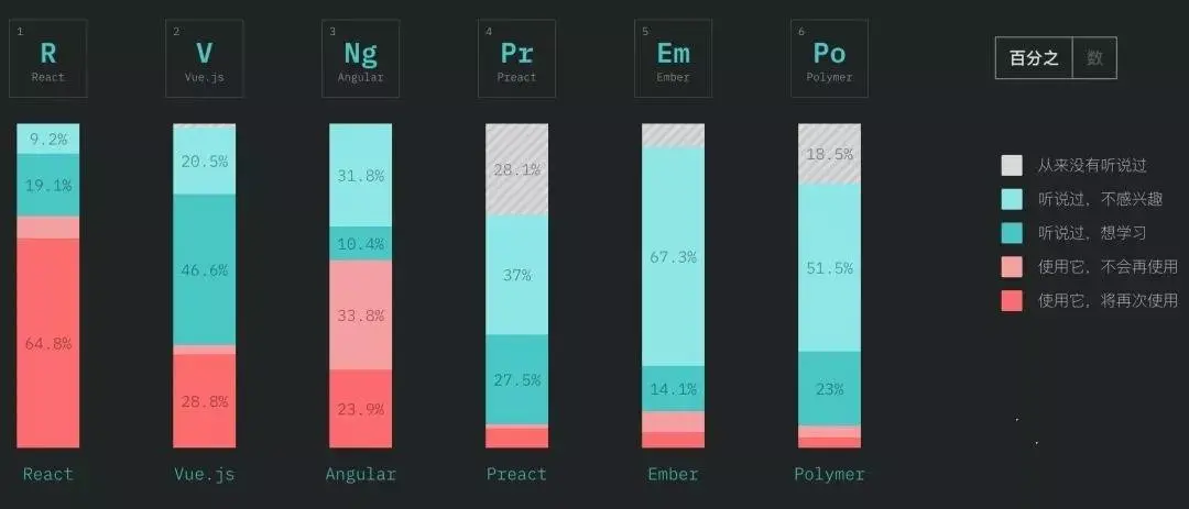 据《2018 年度JavaScript趋势报告》显示,目前React 在前端领域流行度最高, Vue 排名位居第二,但从“使用过并且将再次使用”的比例来看,Vue和React相比仍有不小差距。
