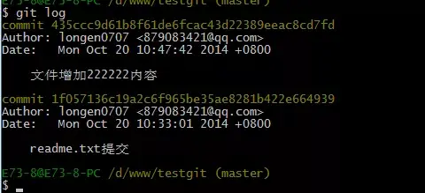 git log命令显示从最近到最远的显示日志,我们可以看到最近三次提交,最近的一次是,增加内容为333333.上一次是添加内容222222,第一次默认是 111111.如果嫌上面显示的信息太多的话,我们可以使用命令 git log –pretty=oneline 演示如下: