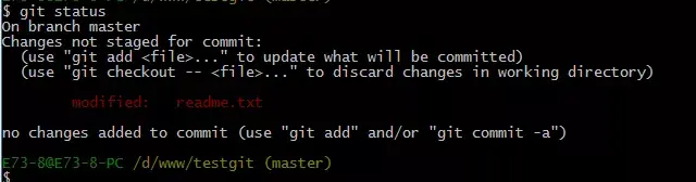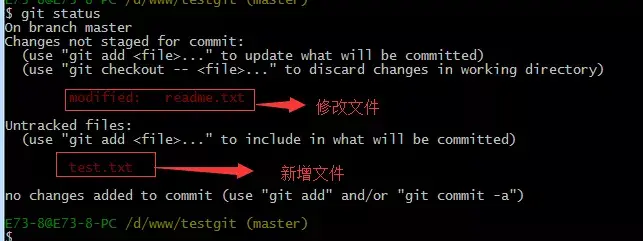 我们在readme.txt再添加一行内容为4444444,接着在目录下新建一个文件为test.txt 内容为test,我们先用命令 git status来查看下状态,如下: