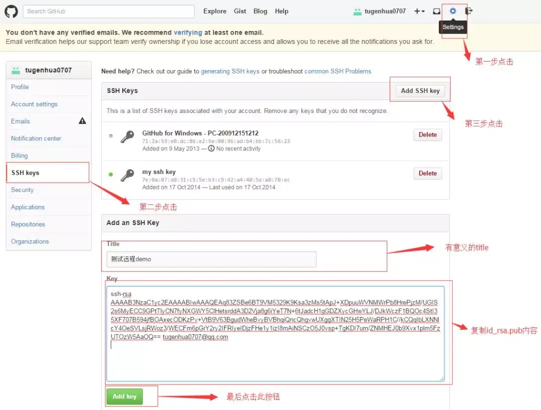 第二步:登录github,打开” settings”中的SSH Keys页面,然后点击“Add SSH Key”,填上任意title,在Key文本框里黏贴id_rsa.pub文件的内容。