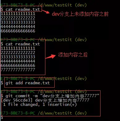 git branch devgit checkout devgit branch查看分支,会列出所有的分支,当前分支前面会添加一个星号。然后我们在dev分支上继续做demo,比如我们现在在readme.txt再增加一行 7777777777777