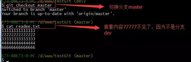现在dev分支工作已完成,现在我们切换到主分支master上,继续查看readme.txt内容如下: