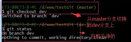 首先,我们来创建dev分支,然后切换到dev分支上。如下操作: