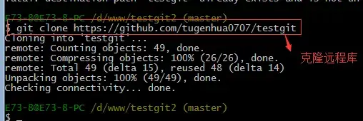 接着进入testgit2目录,进行克隆远程的库到本地来,如下:
