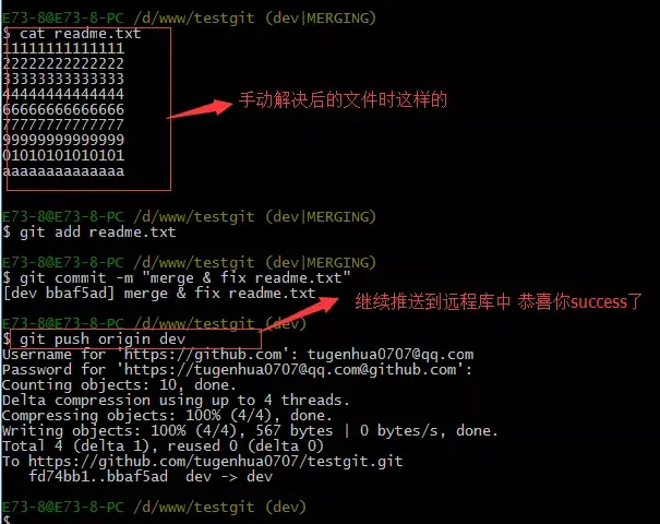 现在手动已经解决完了,我接在需要再提交,再push到远程库里面去。如下所示:
