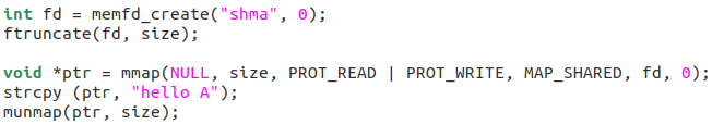 下面的代码进程A通过memfd_create()创建了2片4MB的内存,并且透过socket(路径/tmp/fd-pass.socket)发送给进程B这2片内存对应的fd: