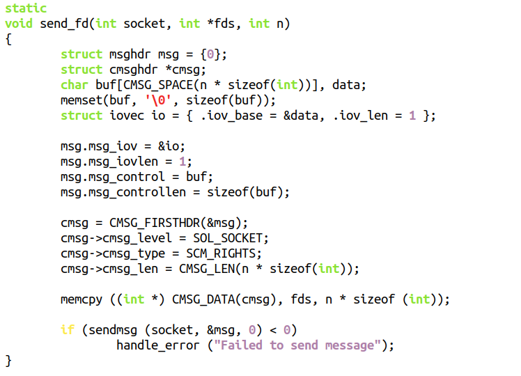 Linux里面的甩锅需要借助cmsg,用于在socket上传递控制消息(也称Ancillary data),使用SCM_RIGHTS,进程可以透过UNIX Socket把一个或者多个fd(file descriptor)传递给另外一个进程。