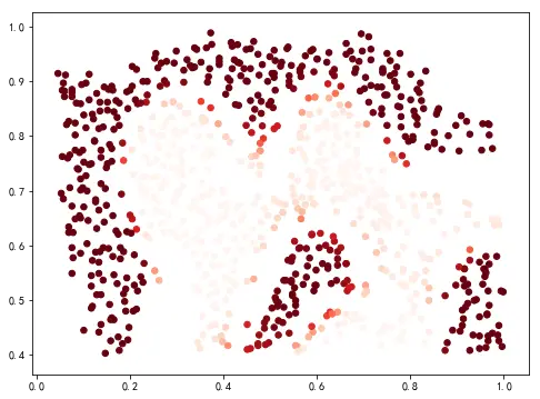 ax.scatter(data2['x1'], data2['x2'], s=30, c=predict_prob, cmap='Reds')