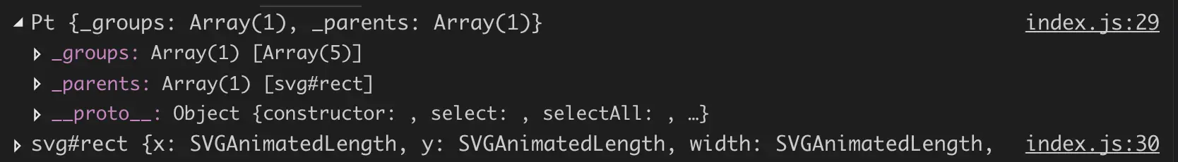 和 jQuery 不一样的是,d3.js 的返回值不是 element,而是 selection,这是官方文档自己的叫法,它是一个 Object,包含了相关信息,通过 console.log 的方式我们大致可以看出它的长相:
